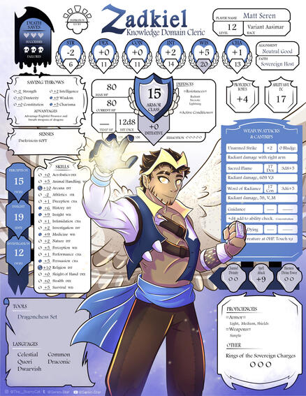3/4th fully rendered character art | Customized original D&D sheet filled in with client-provided stats | Abstract background elements | Personalized first initial of character